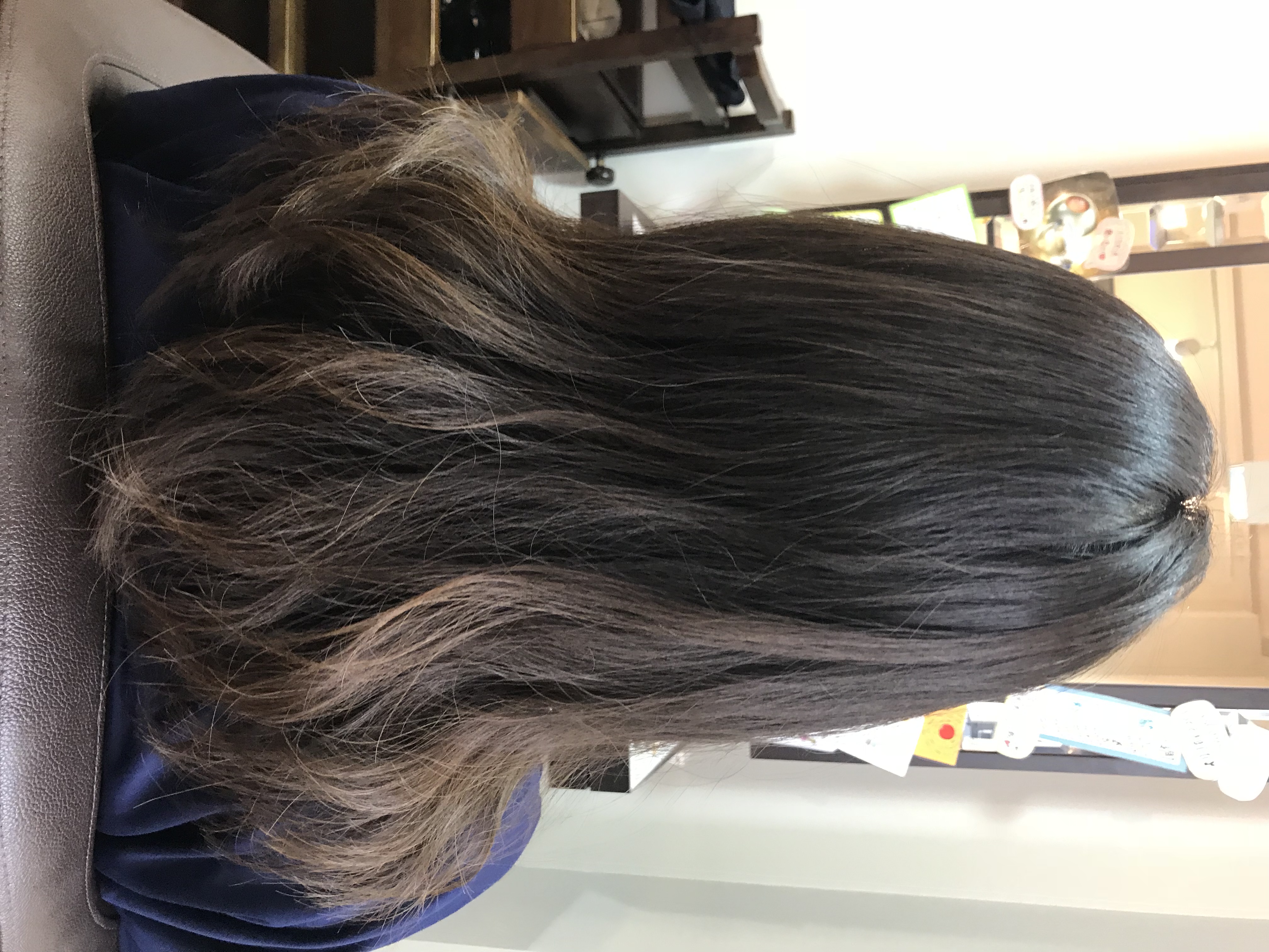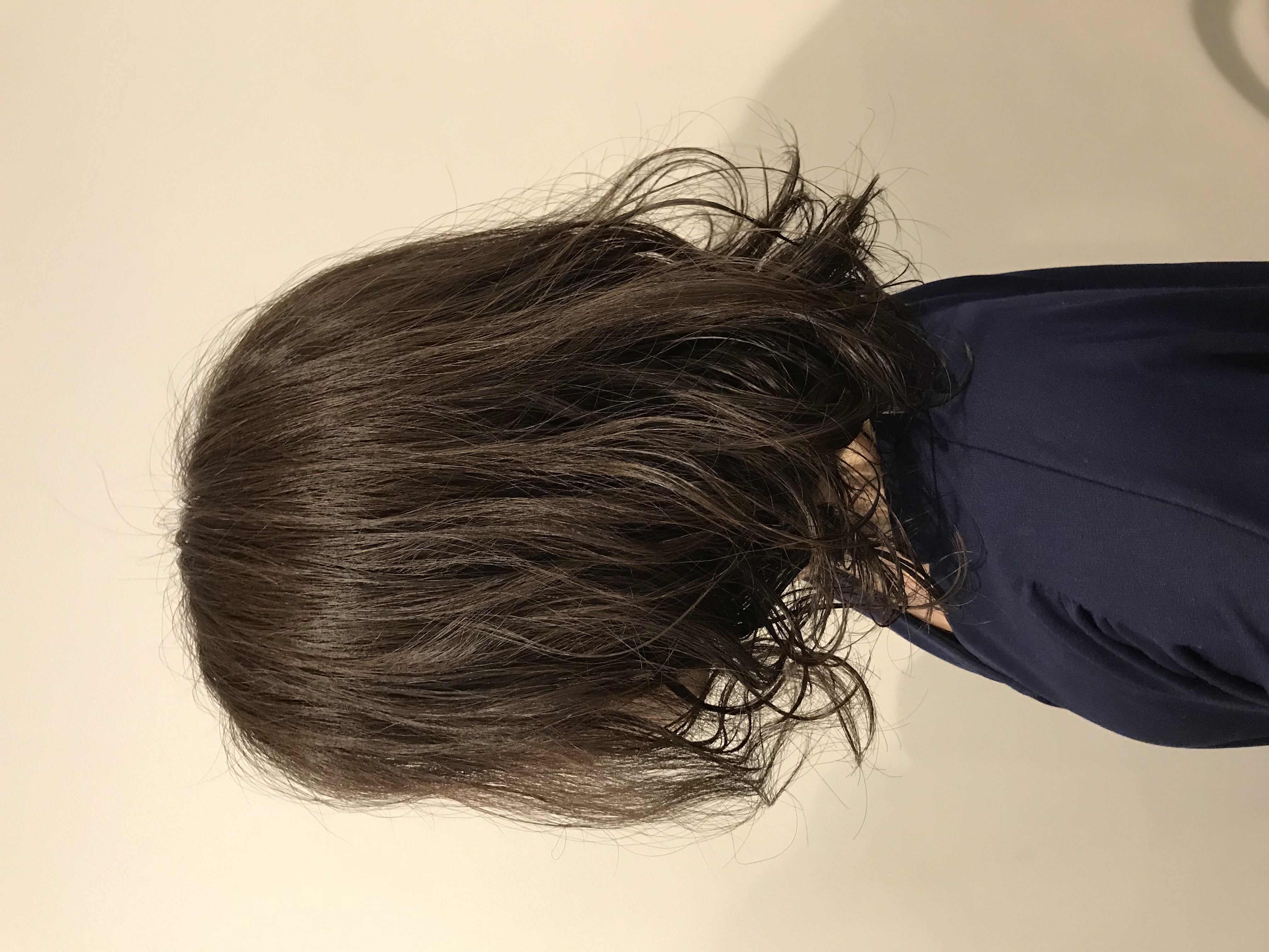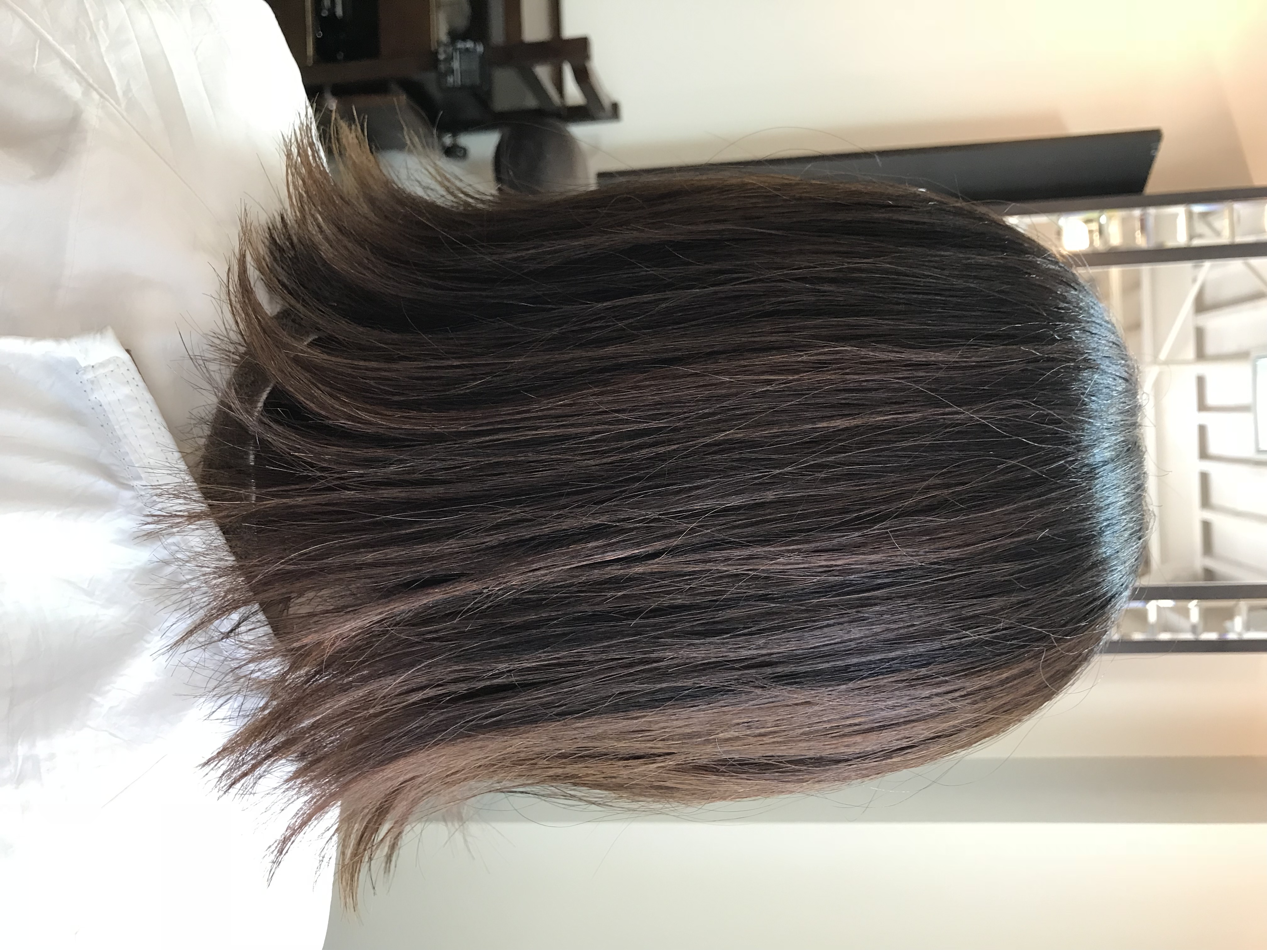 大分のびてて、暑過ぎるとのことで、肩下ぐらいまでバッサリカットして、パーマでふわふわにしてほしいのと、白髪が目立ってきたから暗めの綺麗な色で染めてと言われたので、しっかりとさせて頂きました。